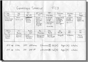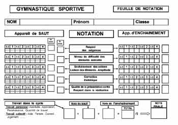 Chaque élève est noté sur un enchaînement ( sur 20 ), sur un saut ( sur 20 ) et sur son travail dans le cycle ( sur 20 )