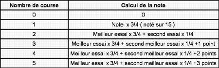 La note finale sur 20 se détermine en fonction des performances et du nombre de courses d’une durée de 20 minutes