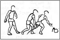 Après l'immobilisation du disque B place la fichette de A au point d'impact, rammasse le disque et se place pour lancer.