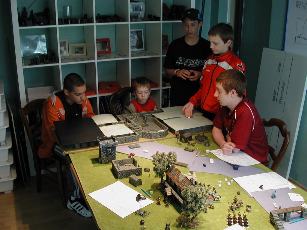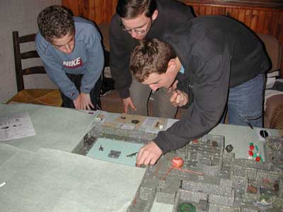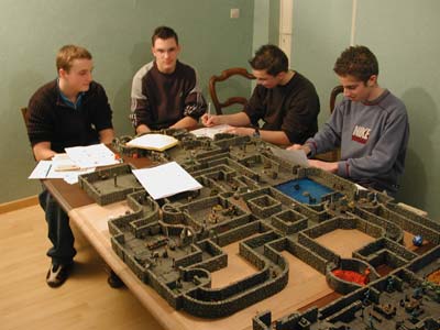 | Le donjon est construit au fur et à mesure. Il faut être assez entraîné et avoir anticipé les plans grandeur nature car le "puzzle" est parfois long à installer. |