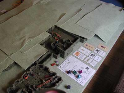 2 équipes de 2 joueurs s'affrontent et doivent être les derniers survivants d'un donjon. Il s'agit alors de mener une stratégie permettant de s'équiper au maximum en progressant dans le labyrinthe tout en échappant à la menace des personnages "non joueur" et à la menace de l'autre équipe. Les différents équipements, bien identifiables grâce aux éléments de décors style "furnitures sets", sont dispersés dans le donjon et le but pour les joueurs et de choisir le chemin le moins risqué et le plus riche. Ce genre de partie "bourrine" est sympa à organiser sur une seule après midi de 4 ou 5 heures.