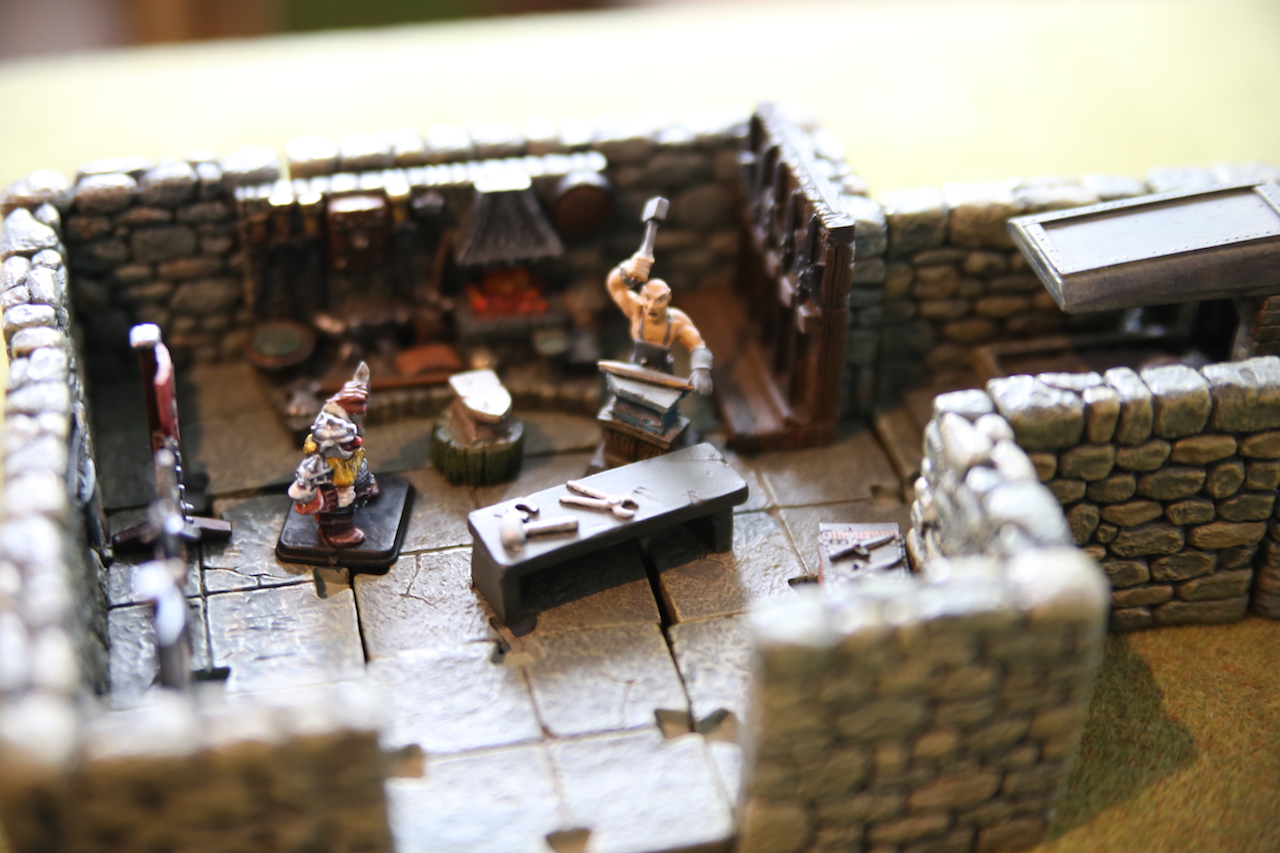 Le nain, avide de nouvelles armes, débute par le forgeron qui fait un bruit bien caractéristique avec son marteau et son enclume. Cet homme si fort d'habitude, peine à manipuler son outil. Il se remet difficilement d'une fatigue intense qui l'amoindrit depuis plus d'une semaine.