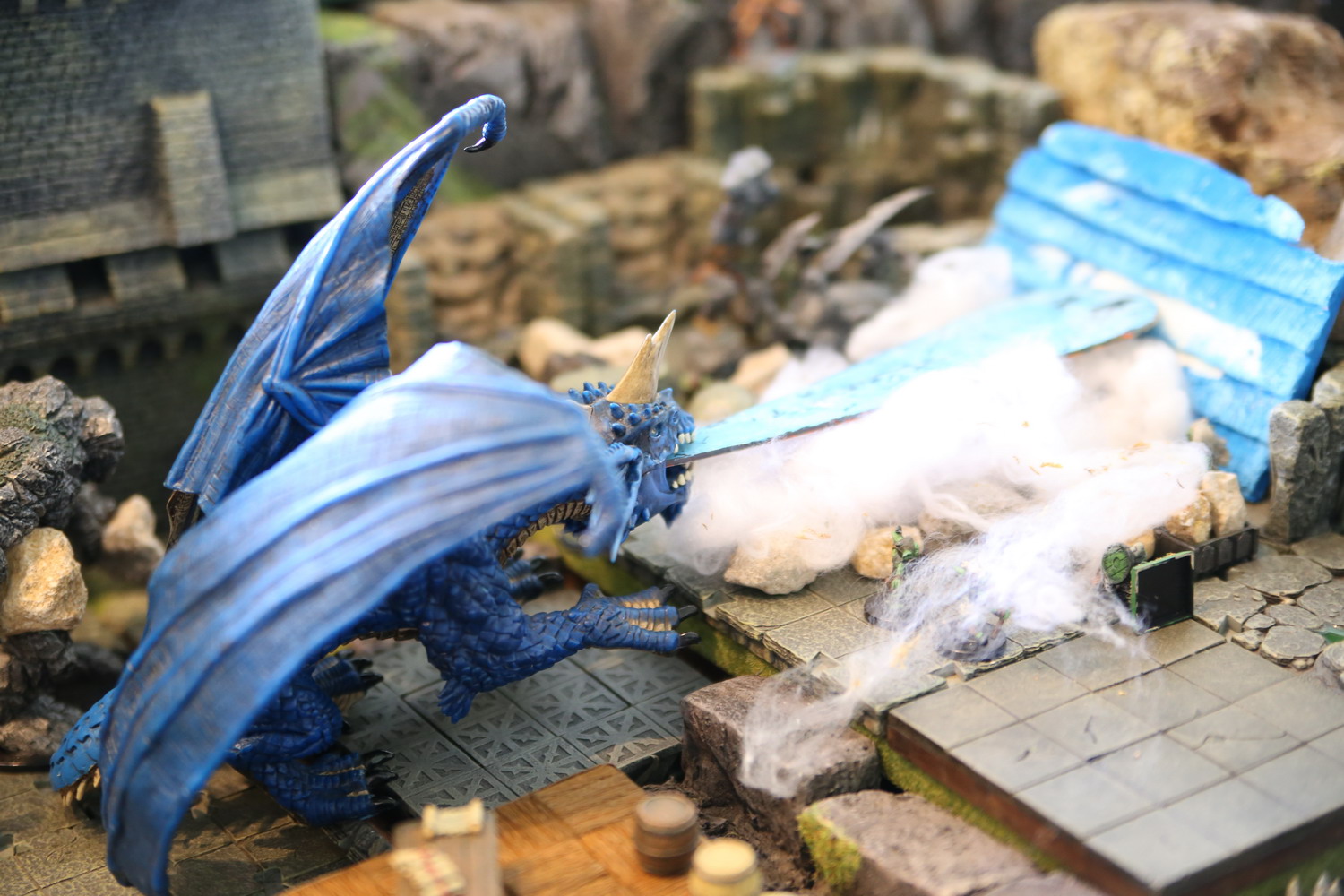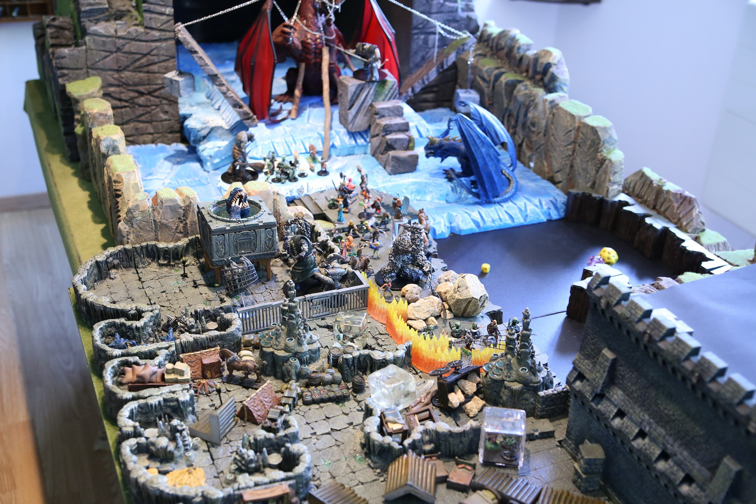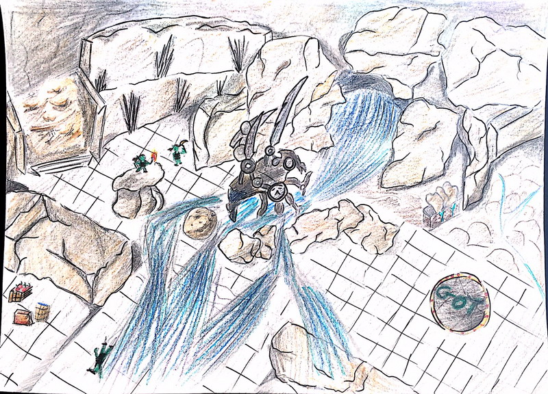 Le barbare se téléporte près de la brèche mais ne peut commander les golems pour tenter de la combler. Le guerrier qui dort dans son grand golem étanche donne "un coup de main" au voleur qui s'est transformé en dragon et tente de glacer l'eau qui sort en trombe.