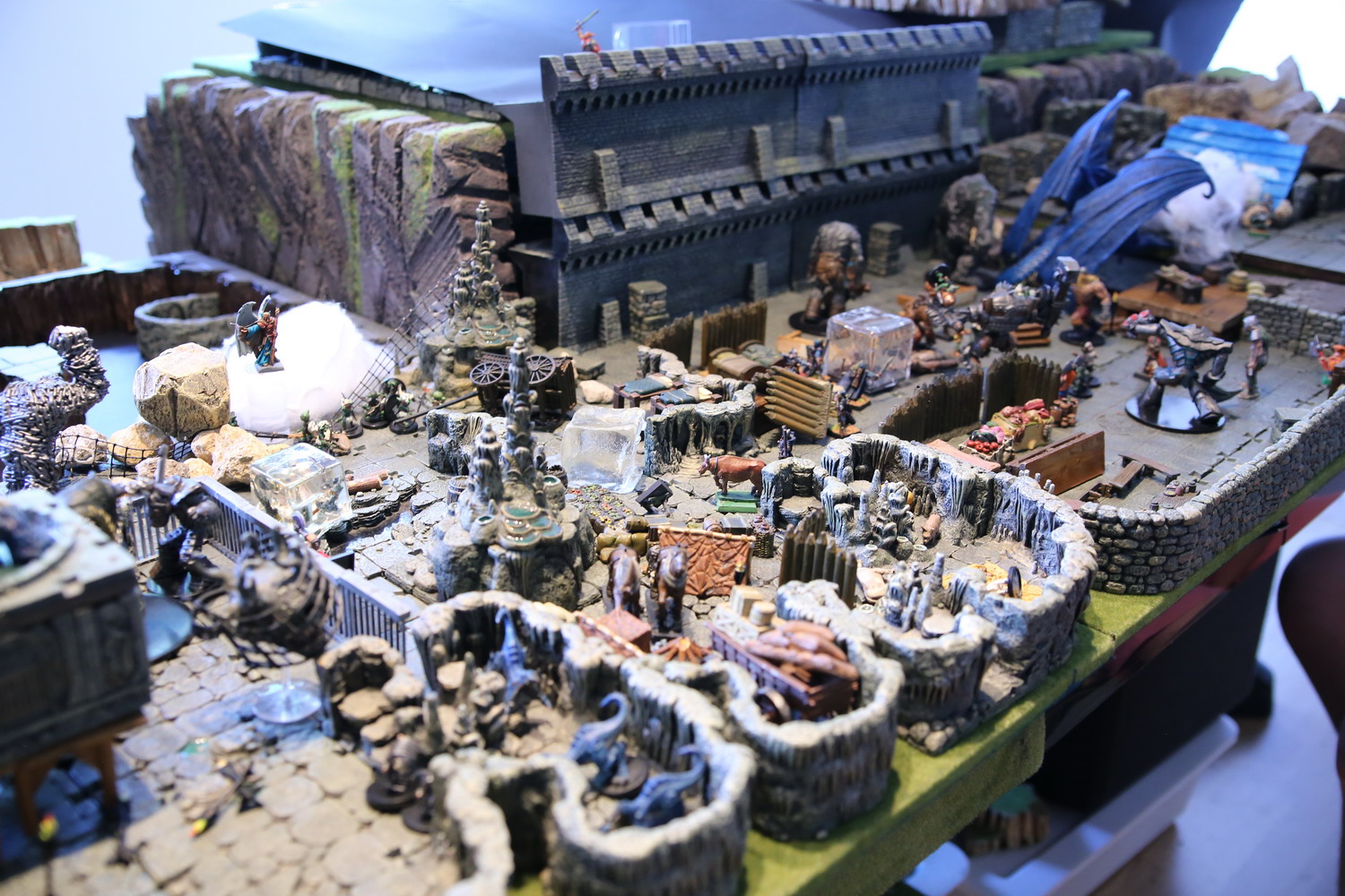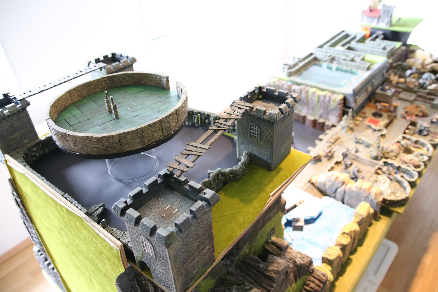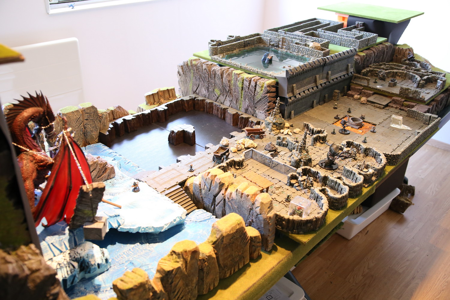 La dépouille du dragon arrive enfin au bord du gouffre. Il aura fallut des milliers d'hommes et de géants, du matériel lourd pour acheminer une telle masse sur une distance si grande. La salle circulaire verte sert depuis des semaines d'ascenseur pour faire descendre les troupes, le matériel et les monstres nécessaires à la construction du plus grand donjon jamais imaginé. Quatre tours sont montées autour de la fosse pour superviser les allers et retours.