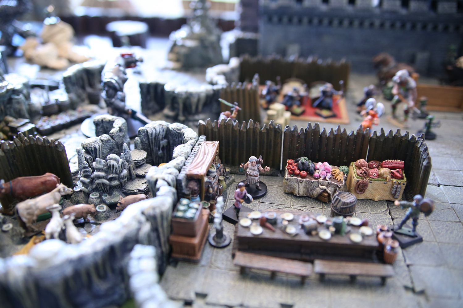 Les monstres, dont la garde semble inquiéter les elfes, sont enchainés ou bloqués par le feu à l'écart sous la garde d'un golem.