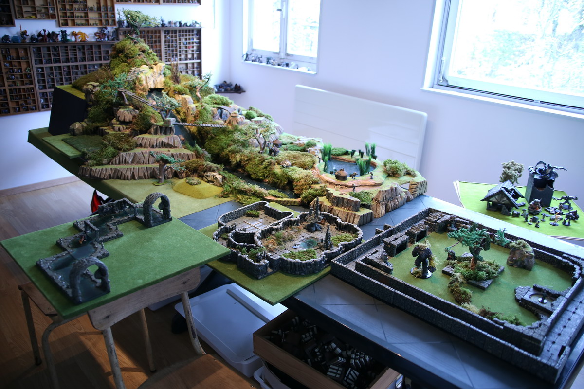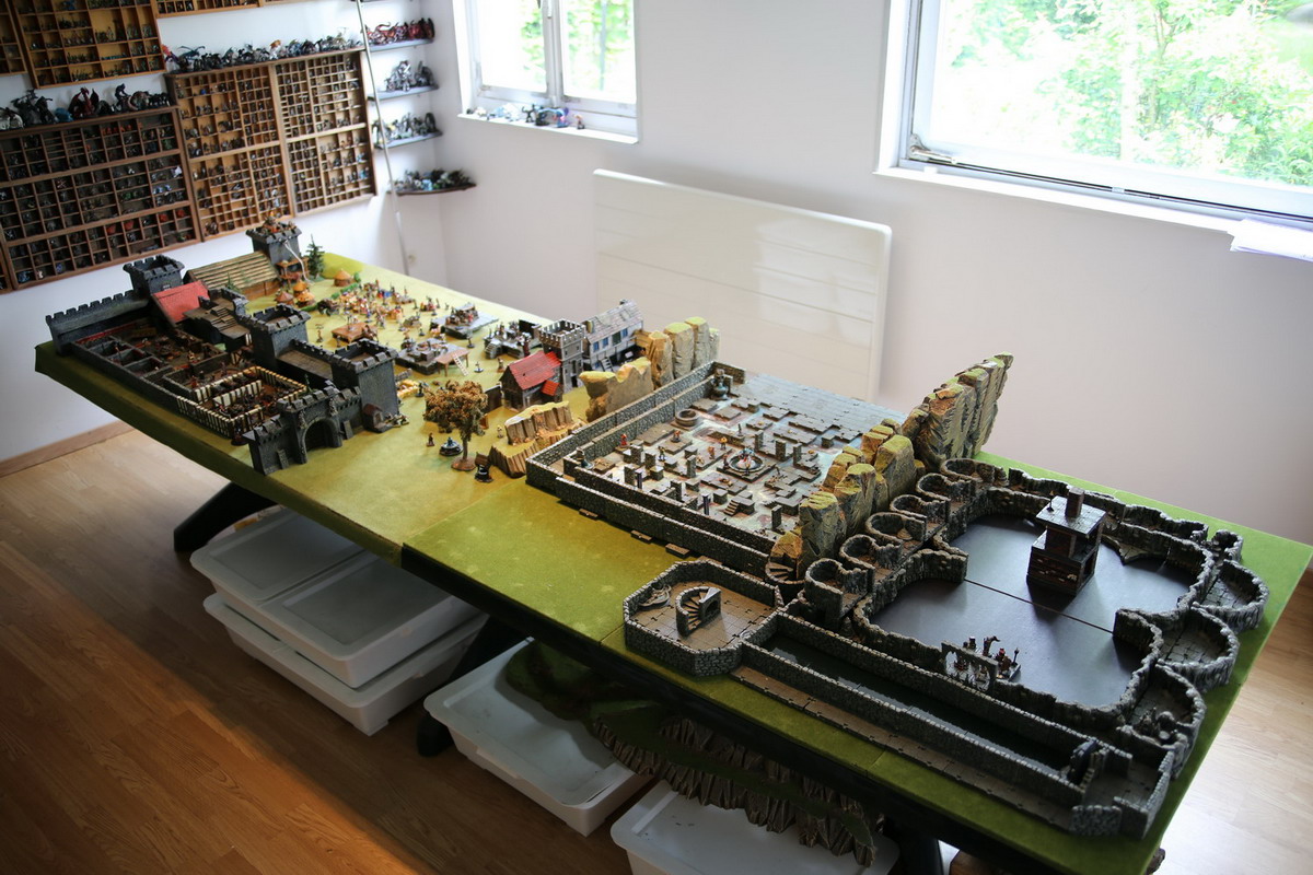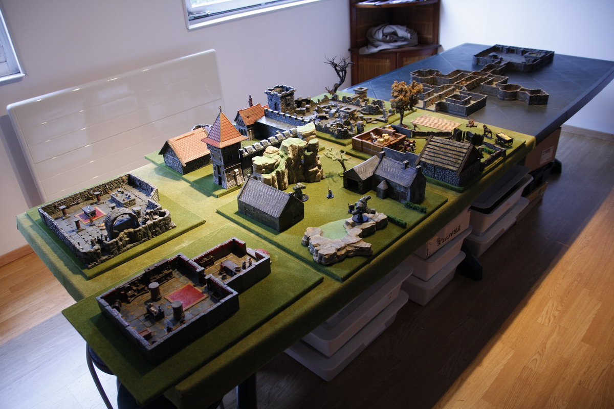 Mon aventure dans les décors en 3 dimensions a ainsi commencé par l'exploitation jusqu'a plus soif des éléments Dwarven Forge. Souvent de vastes tables pour du PMT. Sur un seul étage. Cette table fait 4m². Elle est devenue le logo de mon site web car elle est emblématique des possibilités de ces décors qui s'emboitent à l'infini comme des legos.