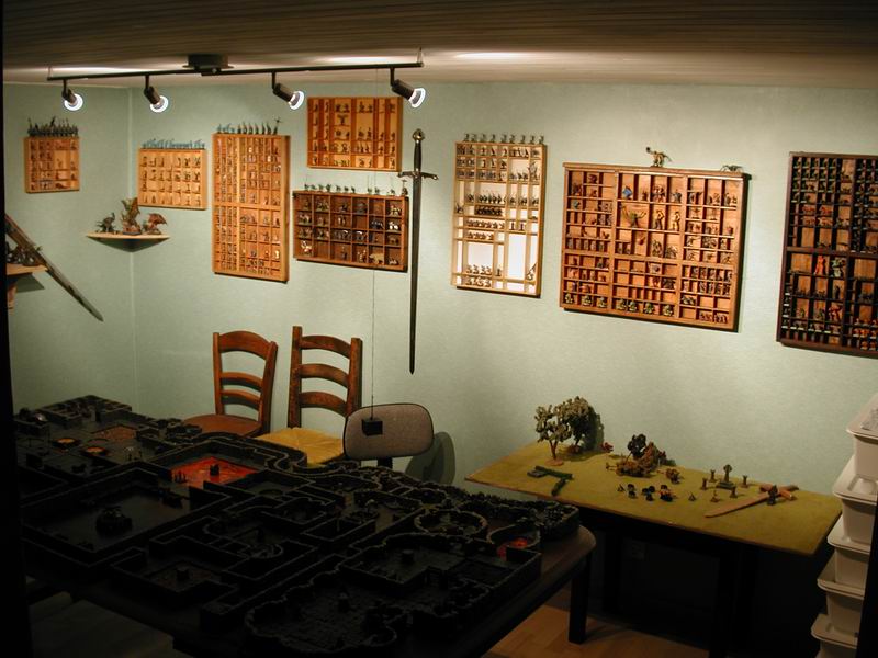 Les murs sont couvert de tiroir d'imprimeur ( +de 20 ) pour les figurines.